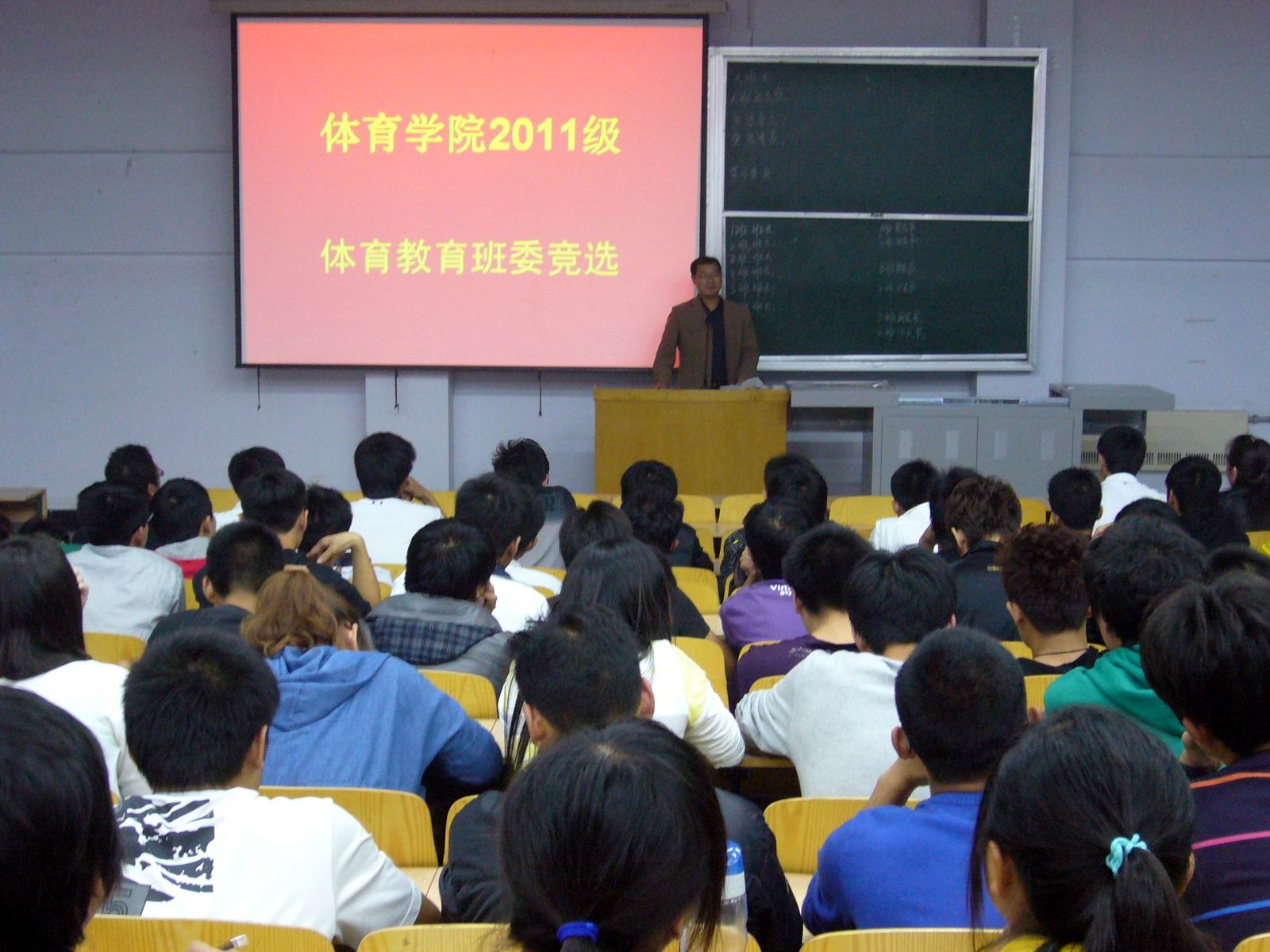 9月28日至10月9日,太阳成tyc7111cc举行2011级新生班委竞选活动。本次班委竞选活动在太阳成tyc7111cc学生工作领导小组的领导下,由太阳成tyc7111cc团总支负责组织,各辅导员老师和高年级班委代表及学长也都积极参与。经过前期认真筹备、积极宣传,同学们对各班委的具体工作职责以及竞选规程都有了详细了解,竞选主要分为预报名、现场主题演讲、全班投票表决等环节。通过初选,2011级社会体育专业有48名同学,体育教育专业有66名同学进入最后阶段的选拔赛。并分于9月28日,10月9日晚,在A合16教室、A合8教室举行了社会体育专业、体育教育专业的班委竞选活动。