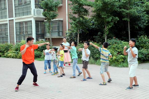 傍晚,迎着微风,我们来到了小区健身场所,小朋友们在追逐打闹,听到我们说要教健美操和武术,就纷纷跑过来说想要学习。在教武术动作时,队员认真严肃的教导,小朋友们也认真的学习,虽然也有调皮的小朋友,但都很乐意学习,教武术的过程中,我们不忘告诫他们,学习武术不是用来打架斗殴的,而是为了强身健体。学习健美操,则是小女孩居多。