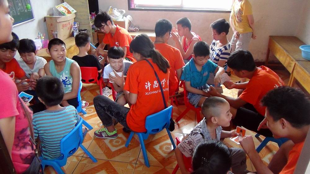 下午三点,在孩子们午休睡醒之后,发现很多日常生活中的常见物品(清洁用具,学习用品,蔬菜,洗涤用品,餐具等生活用品)整齐的摆在庭院的桌子之上。这是老师和队员们尽力找来的生活用品,让孩子们认识实物。首先由老师拿着这些生活用品一一的进行用途方面的讲解。讲解之后,我们的队员们带着孩子上前结合者实物告诉他们每件物品的用途和名称。随后,让孩子们一个一个的说出其名称及用途,队员们在旁边不停地进行纠错。尽力让所有的孩子明白没一件物品的用途和名称。孩子们学得很认真,尽管总是有出错的,我们志愿者仍耐心的给他们指导。随后,我们队员还扮演售货员和导购的角色,陪孩子们进行超市购物的模拟,让孩子们在模拟中体会快乐并学会知识,提高他们学习的积极性。从和孩子们热情和笑容中,就可以看出这次活动的成功。