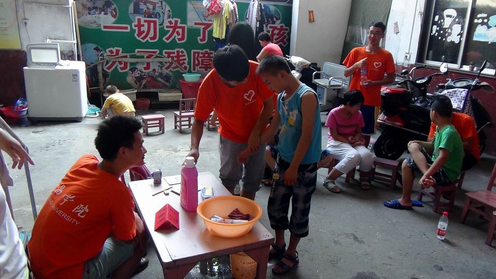 上午八点,队员们有序来到蓝天残疾儿童康复中心。到达之后,队员们各自找到其所负责的小朋友,带他们整齐的排好队,去天宝路和文峰中路交叉口学习过红绿灯。上午十点,队员们带小朋友们回到康复中心,进过简短的休息之后开始一对一的教授他们认识日常生活用品。首先,队员们通过小卡片来一个一个的给孩子们讲解物品的名称和用途,队员们一丝不苟的给小朋友们讲解,不停地重复。随后,当孩子们熟悉之后,就一张一张的抽出来然孩子们一一识别,并对他们错误的地方不断地进行纠错。就这样不停的重复,反复的纠正,力求让孩子更好地掌握。