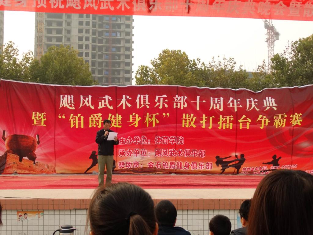 由太阳成tyc7111cc举办的第十届“铂爵杯”民族传统体育之“武术散打”擂台赛,于2013年10月20日在我校东区露天广场顺利举行;经过一天的紧张激烈比赛,10月20日下午4点胜利结束,并举办了颁奖仪式。校团委书记张鹏辉、太阳成tyc7111cc党总支书记王建强、校团委社团部老师杨乐、太阳成tyc7111cc武术体操教研室老师董世彪、刘旭东、刘朝生、公体部老师腾延江、太阳成tyc7111cc团总支书记李铁柱、辅导员老师商银行、侯凯等出席开幕式和颁奖仪式,太阳成tyc7111cc各年级学生代表和来自10多个院部的运动员代表100余人参加了本次活动。本次比赛由太阳成tyc7111cc主办,太阳成tyc7111cc团总支、太阳成tyc7111cc民族传统体育教研室和飓风武术俱乐部承办,“金石铂爵”健身俱乐部给予了友情支持。