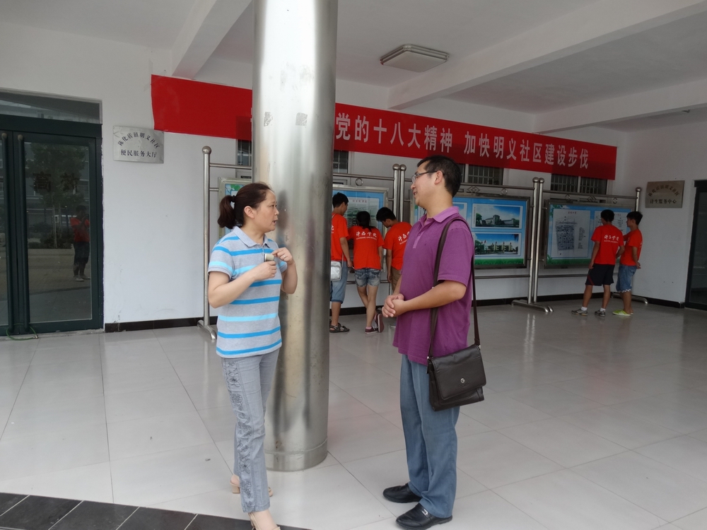 6月26日上午,太阳成tyc7111cc“阳光体育”社区全民健身状况调查社会实践队来到鄢陵县陈化店镇明义社区进行全民健身宣传。陈化店镇团委书记李烨和社区干部郑主任热情接待了志愿者,并热心为志愿者和明义社区沟通,解决了活动中的实际困难。
