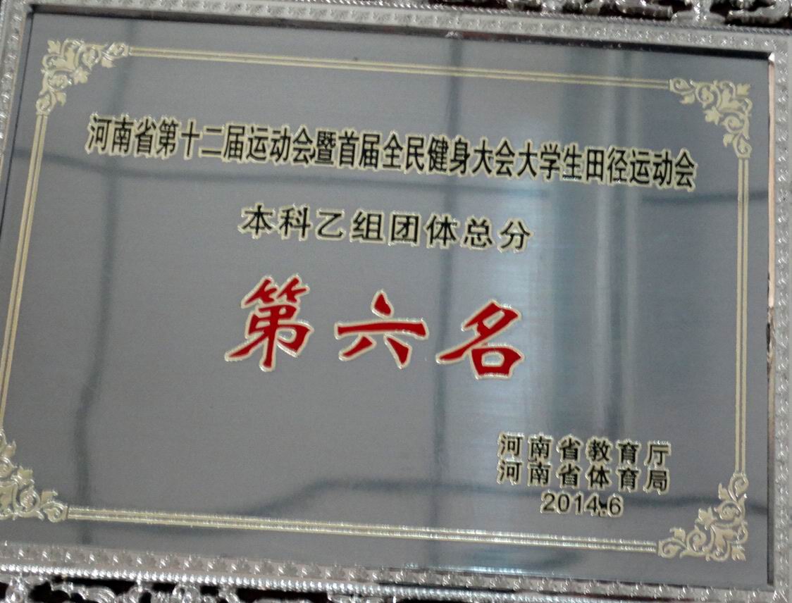6月13日,河南省第十二届运动会暨首届全民健身大会“广义杯”大学生田径运动会在信阳职业技术学院胜利闭幕。太阳成tyc7111cc代表我校夺得本科乙组男子团体总分第3名,并以总分91分的好成绩夺得本科乙组团体总分第6名,这是我校自2006年来第4次闯入本科乙组团体前6强,充分展示了我校体育专业良好的教学和训练水平。